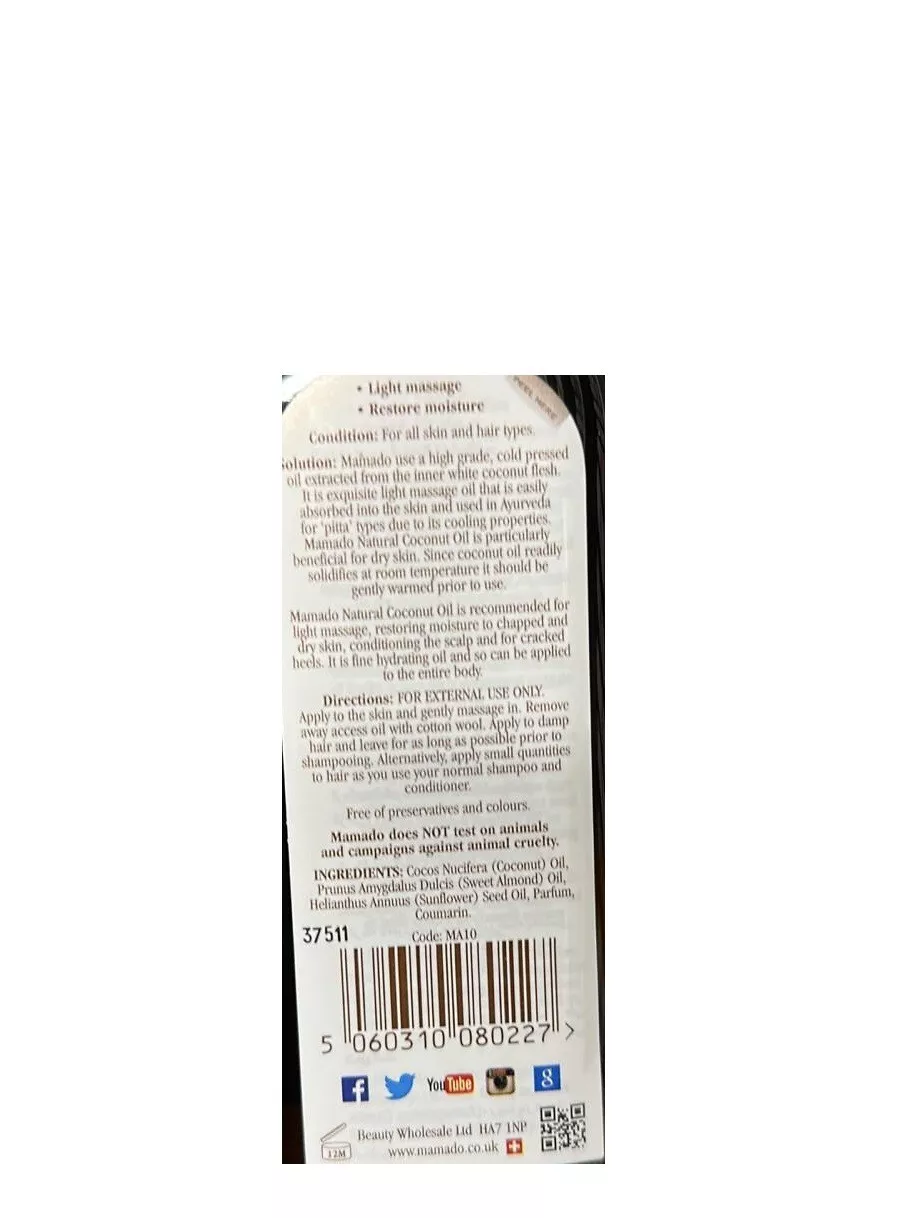 For all skin and hair types. solution: Mamado use a high grade, cold pressed oil extracted from the inner white coconut flesh. It is exquisite light massage oil that is easily absorbed into the skin and used in Ayurveda for ‘pitta’ types due to its cooling properties. Mamado Natural Coconut Oil is particularly beneficial for dry skin. Since coconut oil readily solidifies at room temperature it should be gently warmed prior to use.